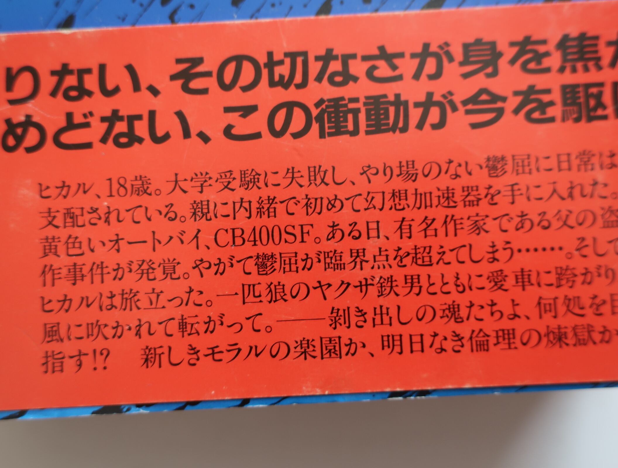 大学受験に失敗したヒカルは、鬱屈した日々の中、ついに念願のバイク、黄色のCB400SF、を手に入れる。しかし、恋人の萌子が妊娠してしまい……。風に吹かれ、転がって、絶望と逃避行の青春が走り出す。ハードカバー本